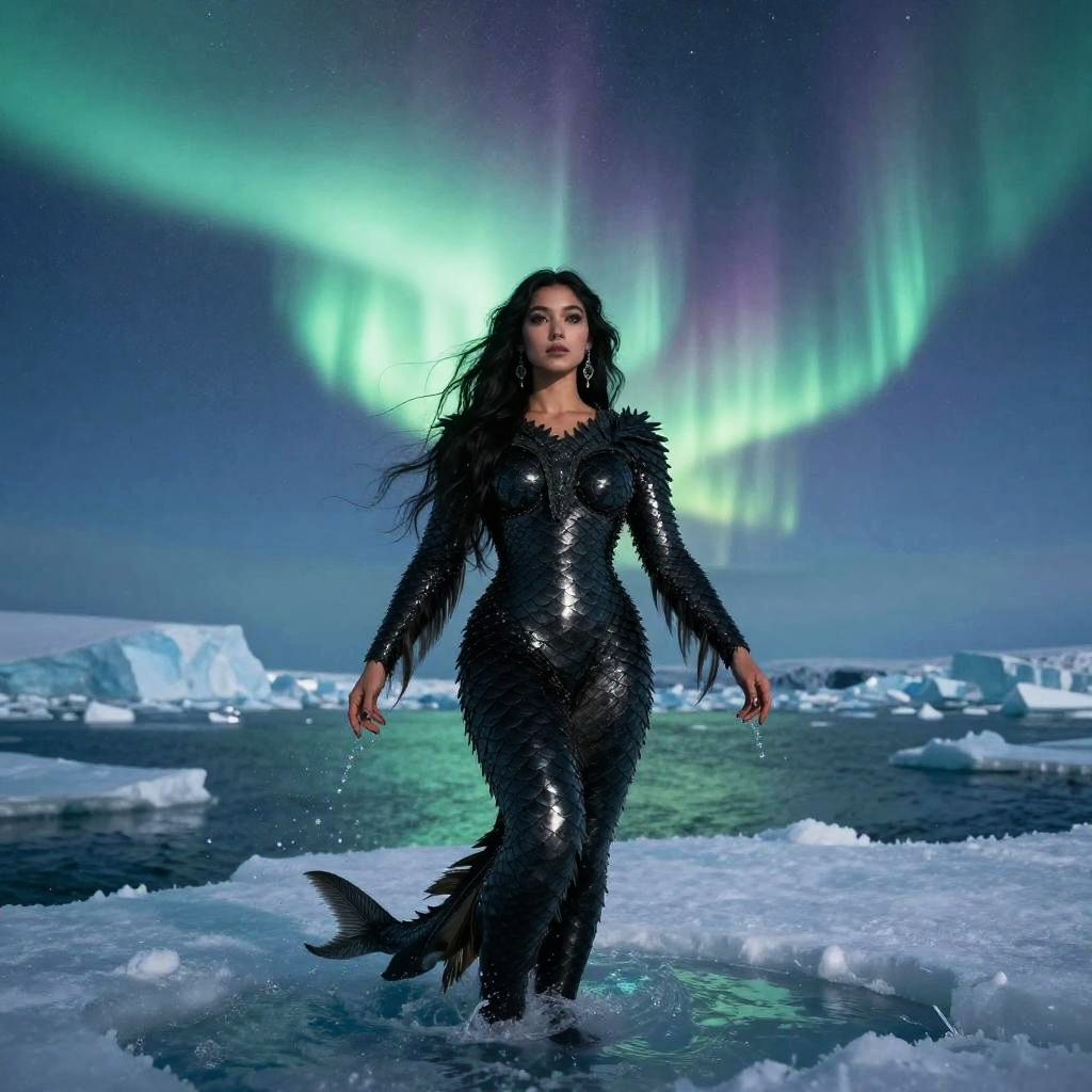 Black Mermaid in Arctic Waters with Aurora Borealis