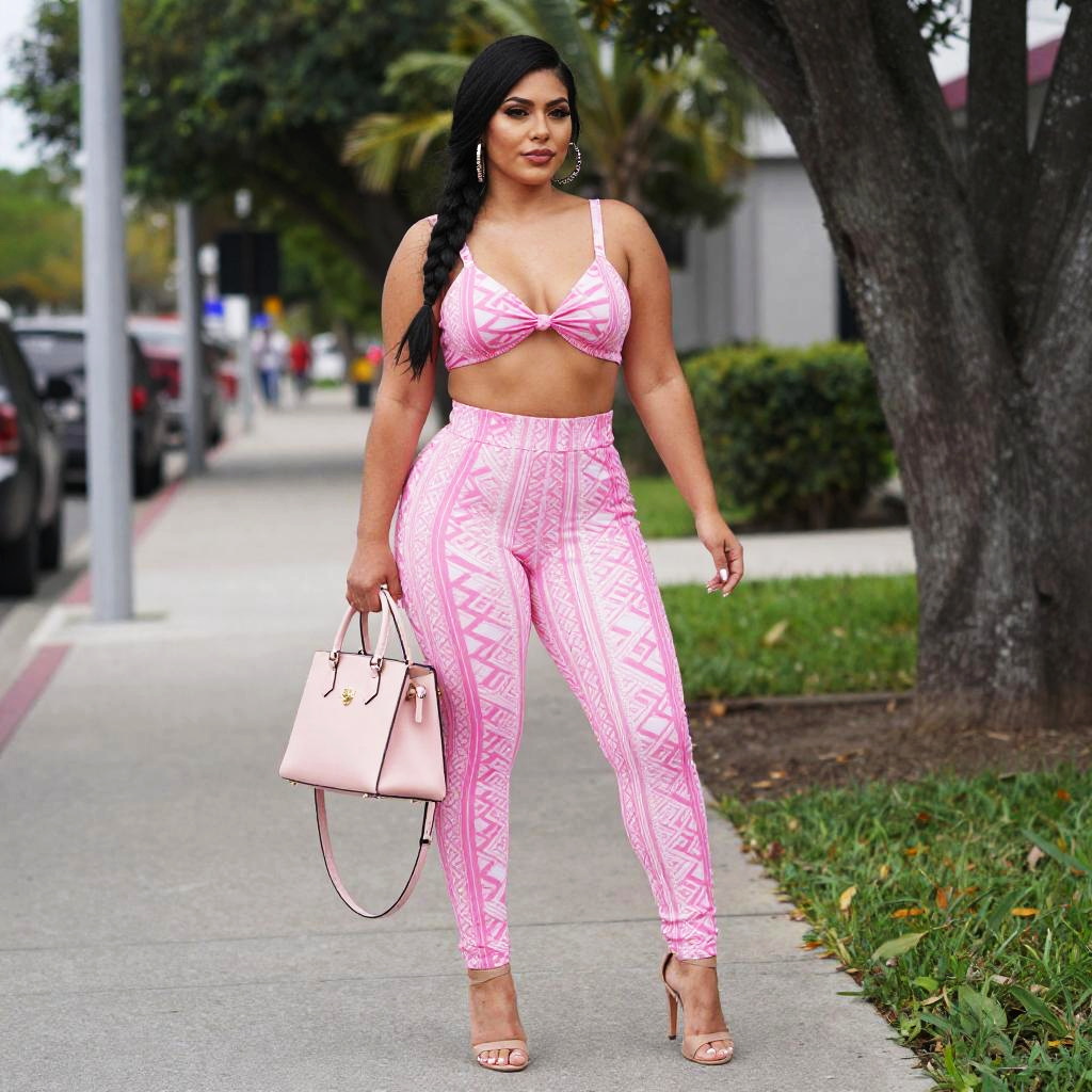 A confident woman walks down a city sidewalk wearing a matching pink patterned crop top and high-waisted leggings ensemble. She accessorizes her stylish outfit with nude high-heeled sandals and a blush pink handbag, exuding a modern, urban chic vibe.