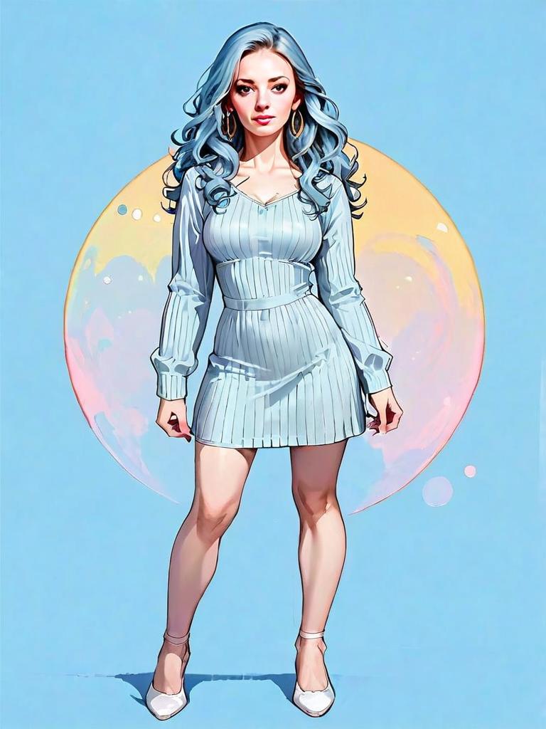 A realistic full-body digital illustration of a confident woman with long, wavy blue hair standing against a pastel blue background with an abstract, circular glow behind her. She wears a stylish, fitted, ribbed light blue dress paired with white heels and gold hoop earrings, blending modern fashion with a comic-inspired art style.