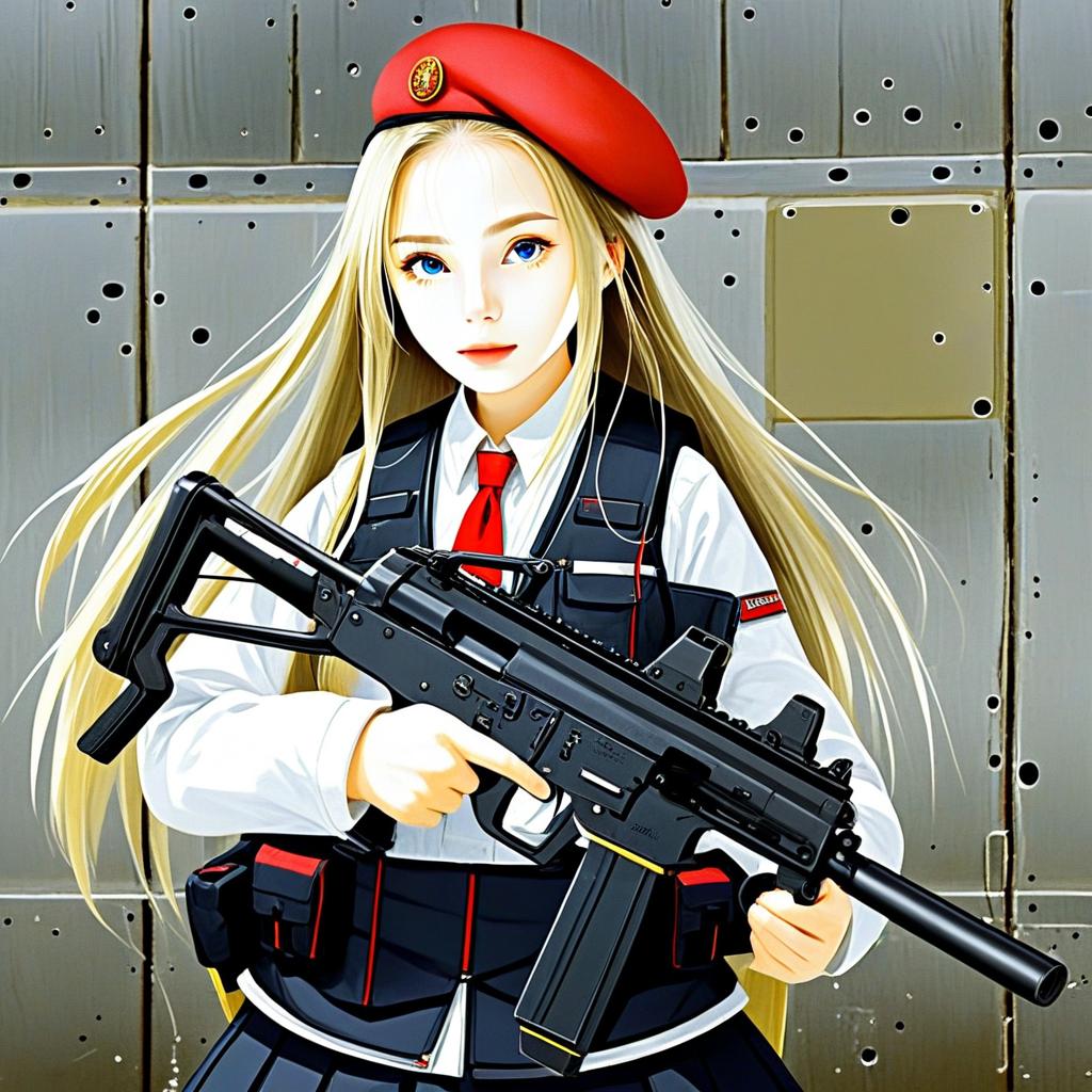 An anime-style illustration of a blonde woman with striking blue eyes wearing a red beret and tactical gear, holding an MP5 submachine gun. The character is depicted in a detailed and vibrant style with a military-themed backdrop featuring a metal wall with bullet holes. The image combines elements of modern tactical design and classic anime aesthetics.
