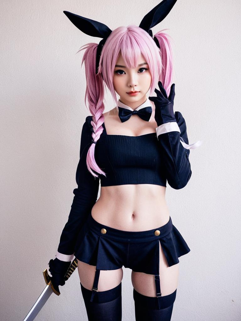 A young woman in a detailed cosplay outfit inspired by the character Astolfo Saber from the Fate series, featuring pink twin-tail hair adorned with black bunny ears. She is dressed in a black crop top and short skirt with garter straps, holding a sword, embodying a stylish and confident pose against a plain background. The photo reflects a high-quality realistic cosplay style with sharp focus and vibrant colors.