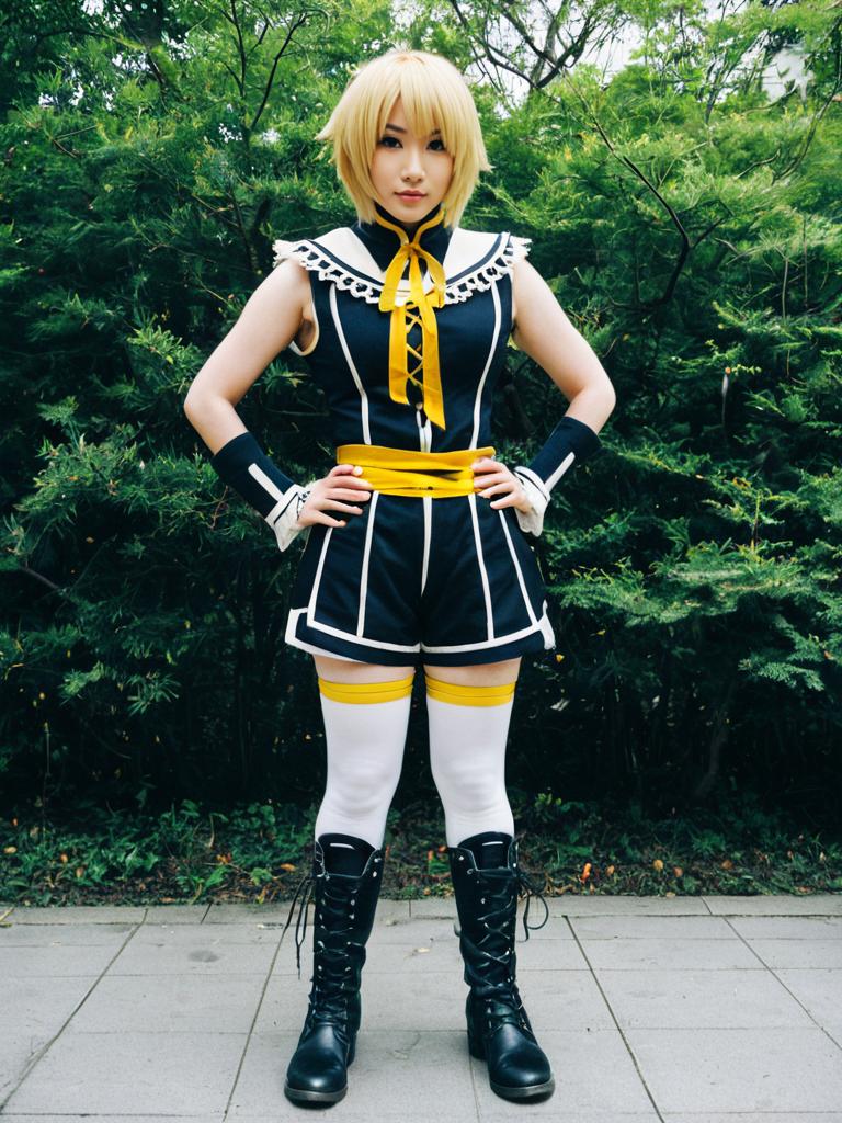 A woman dressed in a detailed Monoyoshi Sadamune cosplay stands confidently outdoors against a lush green background. The costume features a navy blue and white sailor-style outfit accented with yellow ribbons, thigh-high white stockings, and black combat boots, embodying a vibrant and modern interpretation of the character.