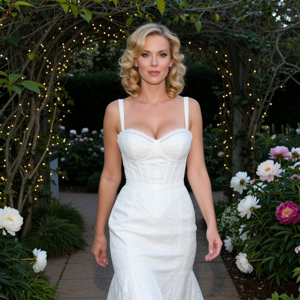A woman elegantly walks down a garden path adorned with blooming flowers and twinkling fairy lights. She is wearing a form-fitting white dress with delicate lace details, exuding a vintage-inspired glamour with her soft curled hairstyle.