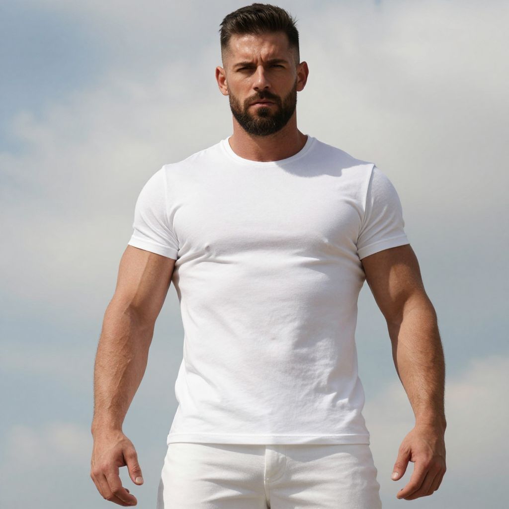 A muscular man stands confidently against a cloudy sky, wearing a fitted white t-shirt and white pants. The natural lighting highlights his strong physique and focused expression, creating a clean, minimalistic look.