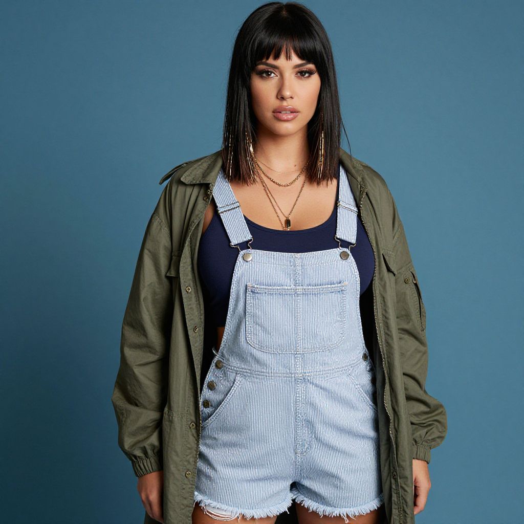 A confident woman poses against a solid blue background wearing light blue denim short overalls layered over a navy tank top and an oversized olive green jacket. Her straight, dark hair with bangs and delicate gold necklaces complete this casual yet chic look.