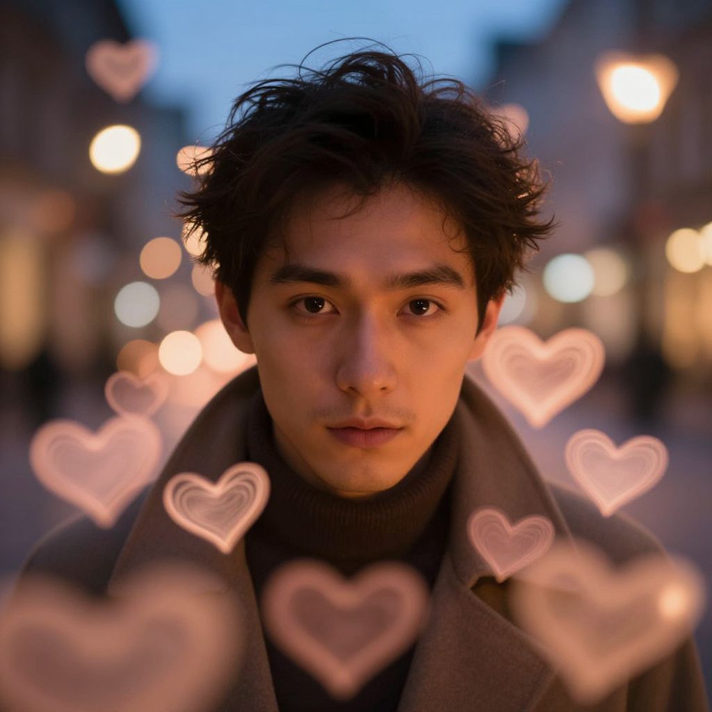 A close-up portrait of a young man with styled dark hair, wearing a brown coat and turtleneck, set against a softly blurred urban background with warm street lights. The photo features artistic heart-shaped light bokeh effects, adding a romantic and dreamy atmosphere to the image.