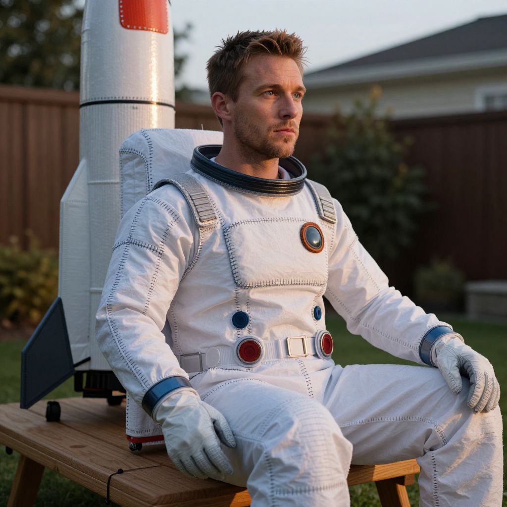 A man dressed in a detailed white astronaut suit sits thoughtfully on a wooden bench outdoors, with a model rocket positioned behind him. The image captures a contemplative mood and features realistic textures in the costume and equipment, set against a suburban backyard background.