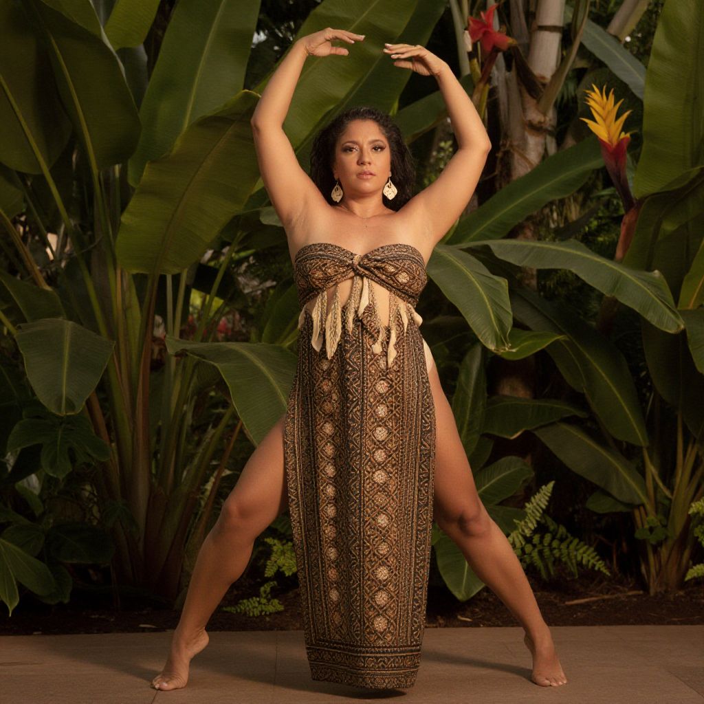 A confident woman strikes a graceful pose in a tropical setting, surrounded by lush green foliage and vibrant flowers. She wears a patterned, strapless dress with a high slit, complemented by statement earrings, embodying a natural and elegant style.
