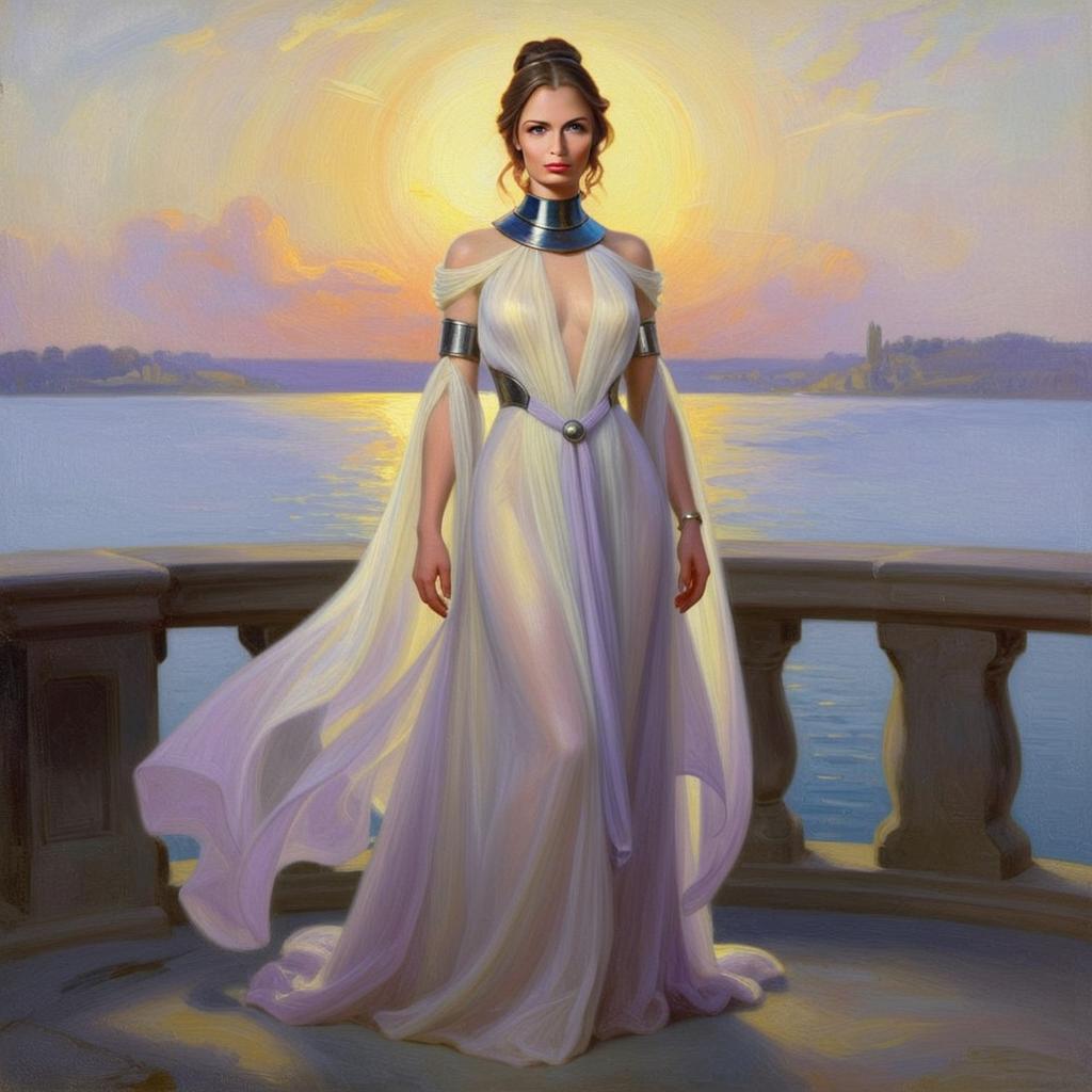 A regal woman stands on a balcony overlooking a serene body of water at sunset, dressed in a flowing, ethereal gown with metallic accents reminiscent of ancient or fantasy-inspired fashion. The soft lighting and painterly style evoke a classical portrait with modern fantasy elements, highlighting elegance and strength.