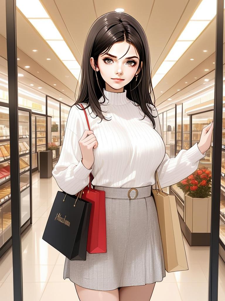 A stylish woman holds an ice cream cone while standing in a modern supermarket aisle. She showcases a chic outfit featuring a fitted sweater and a flowy skirt, embodying contemporary fashion trends. The bright, clean interior of the store adds to the vibrant atmosphere of the scene.