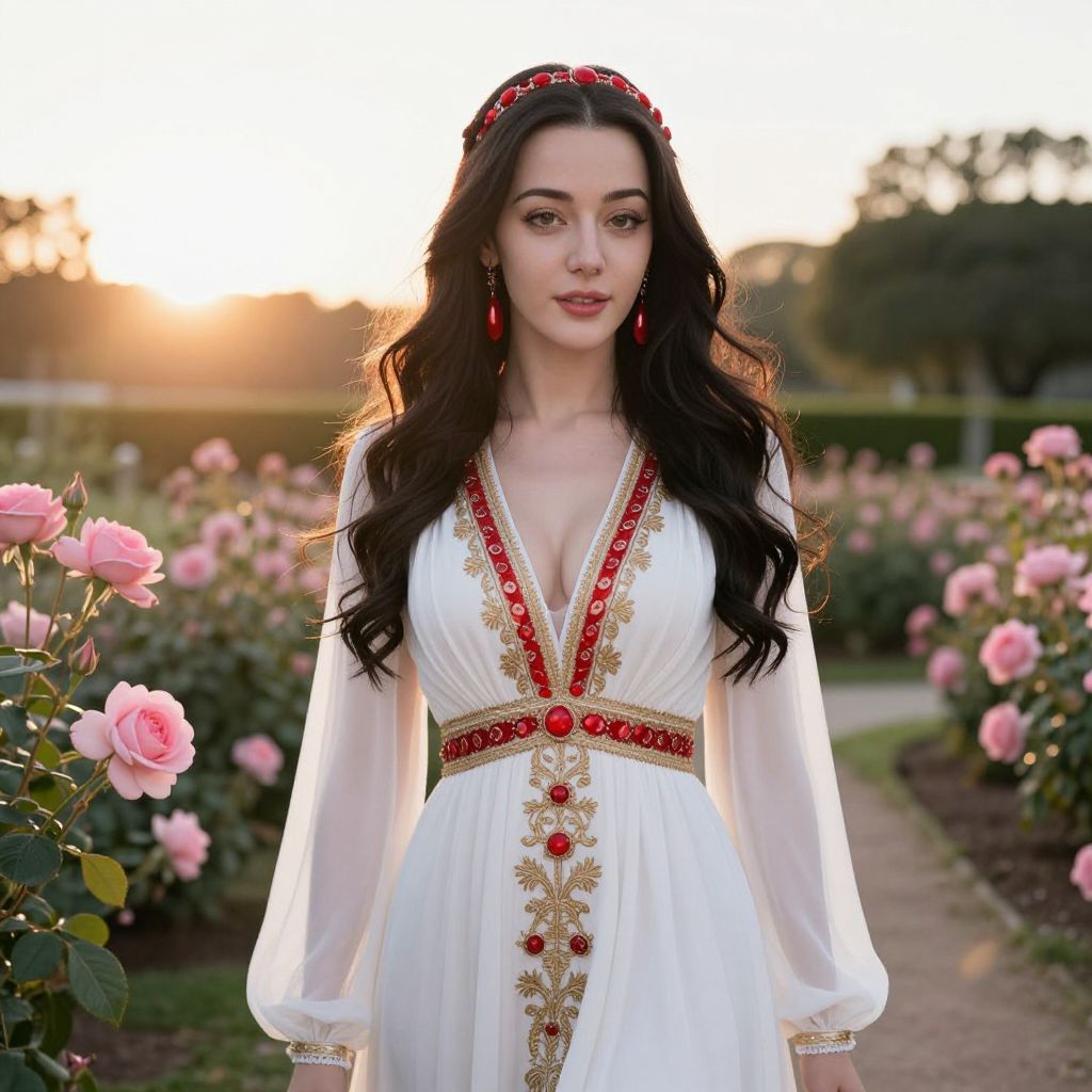 Elegant Woman in Embroidered White Dress with Red Jewels in Rose Garden