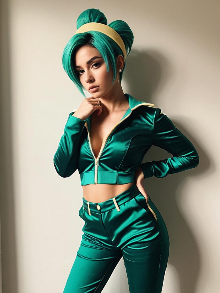 A confident woman poses in a striking, shiny green outfit inspired by Jolyne Cujoh from the JoJo's Bizarre Adventure series. Her vibrant teal hair styled in two buns and carefully detailed costume capture the essence of this popular anime character with a modern, realistic touch.