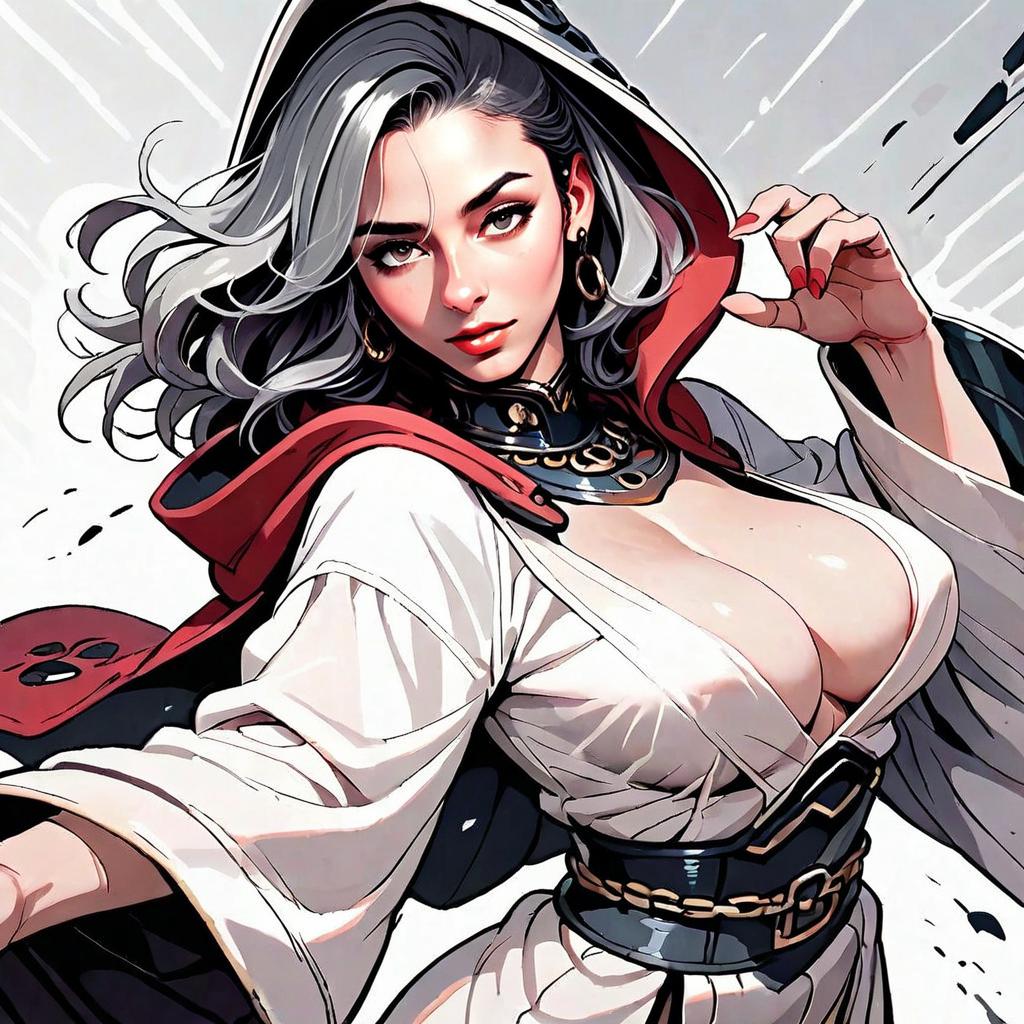 This digital artwork features a confident woman with silver hair and striking green eyes, dressed in a stylish white outfit accented with a red hooded cape and a black belt with gold chain details. The illustration showcases a modern anime-inspired art style, characterized by clean lines, vibrant colors, and dynamic shading that emphasizes the character's strong presence.