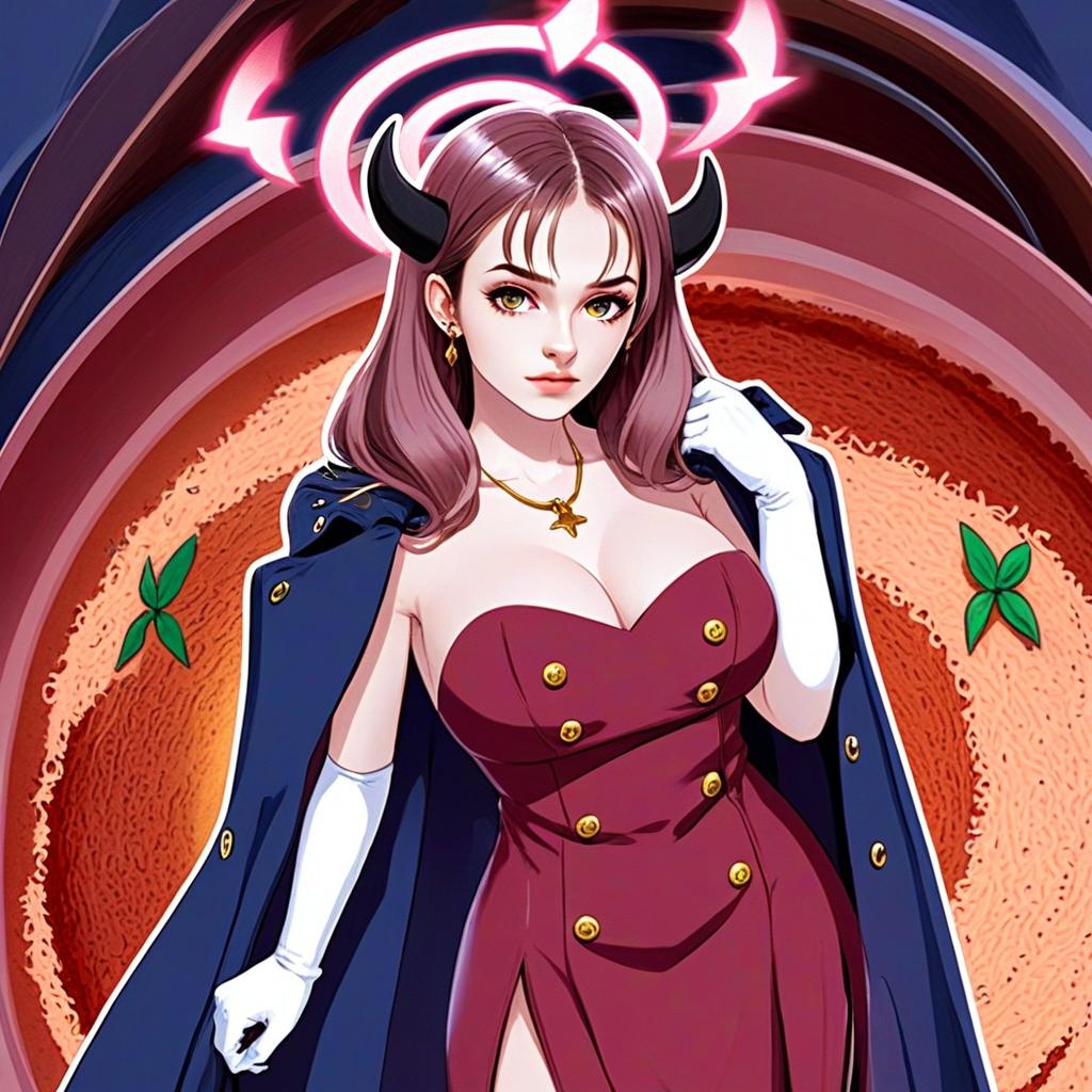 Anime Woman in Elegant Red Dress with Horns and Navy Coat