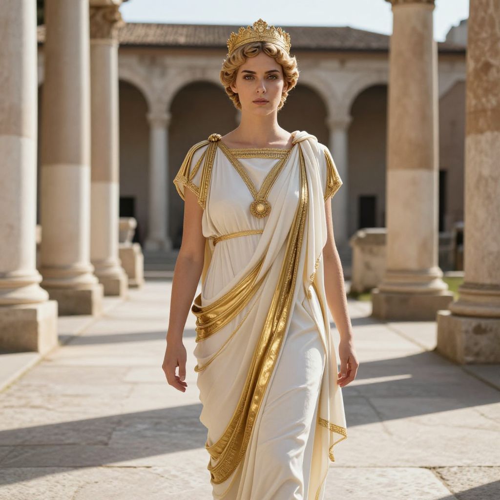 A woman dressed in an elegant ancient Roman-style white and gold toga stands confidently in a classical stone courtyard with columns. The attire and setting evoke a historical and regal atmosphere, highlighting the intricate gold details on her garment and her composed expression.