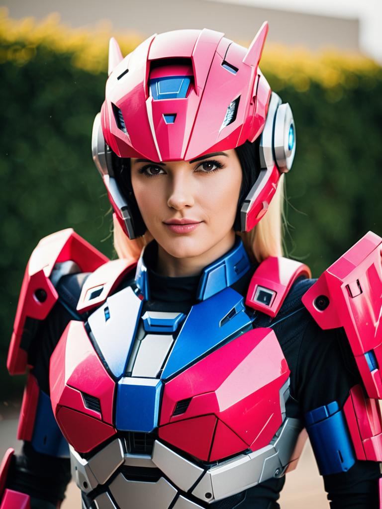 A woman dressed in an elaborate, realistic cosplay costume inspired by Arcee, a character from the Transformers franchise. The vibrant armor features striking pink and blue colors with futuristic and robotic design elements, highlighting the detailed craftsmanship typical of high-quality cosplay photography.