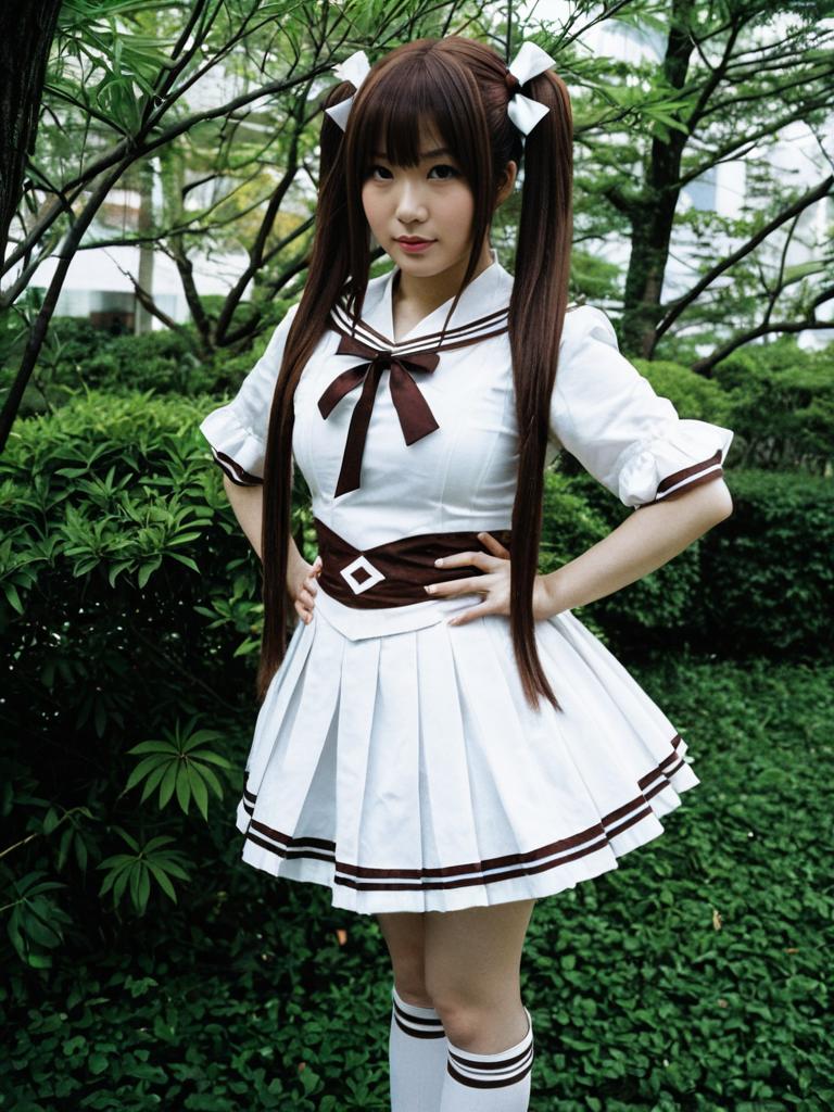 A young woman dressed in a white and brown sailor-style school uniform poses confidently outdoors amidst lush greenery. Her long twin ponytails with white ribbons complement the traditional Japanese schoolgirl cosplay aesthetic.