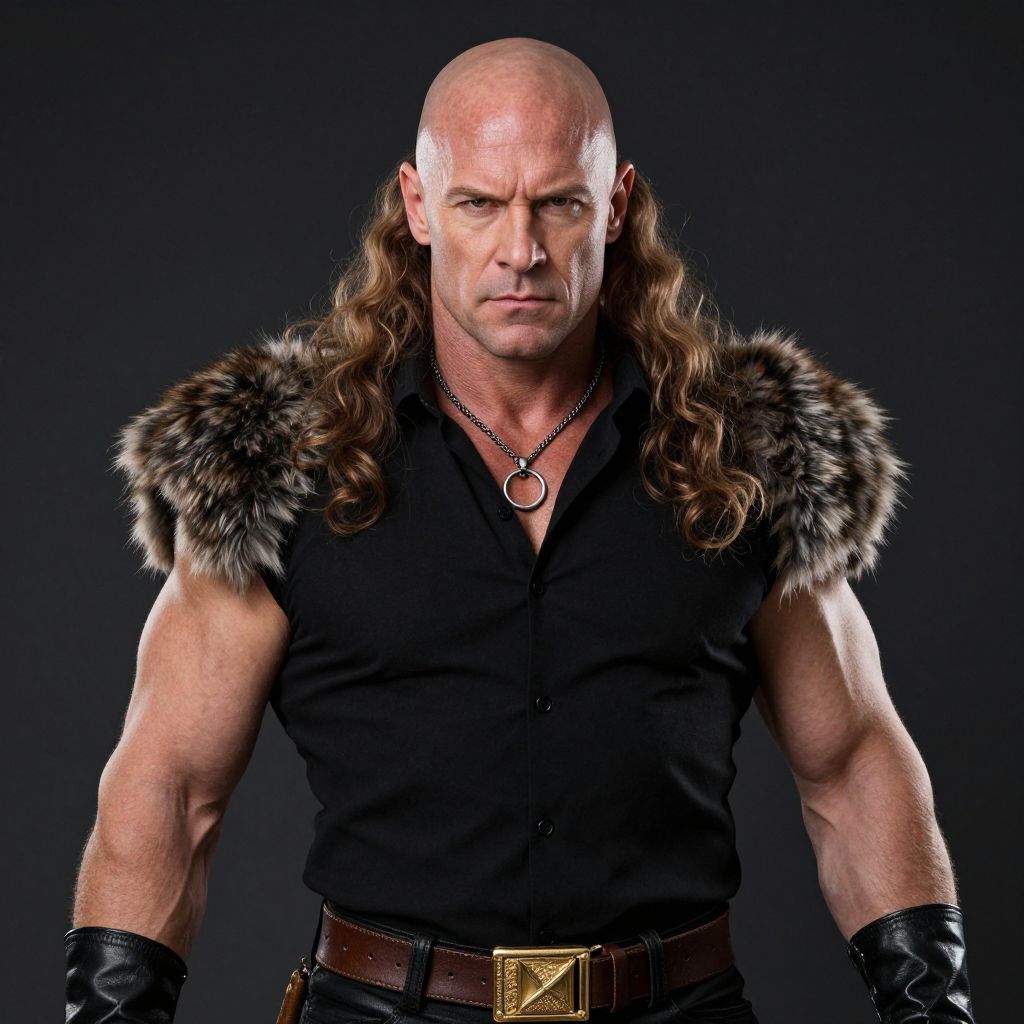 A bald man with long curly hair on the sides is dressed in a black sleeveless shirt featuring fur accents on the shoulders. He wears a leather belt with a decorative buckle and black gloves, striking a fierce and intense pose against a plain dark background.