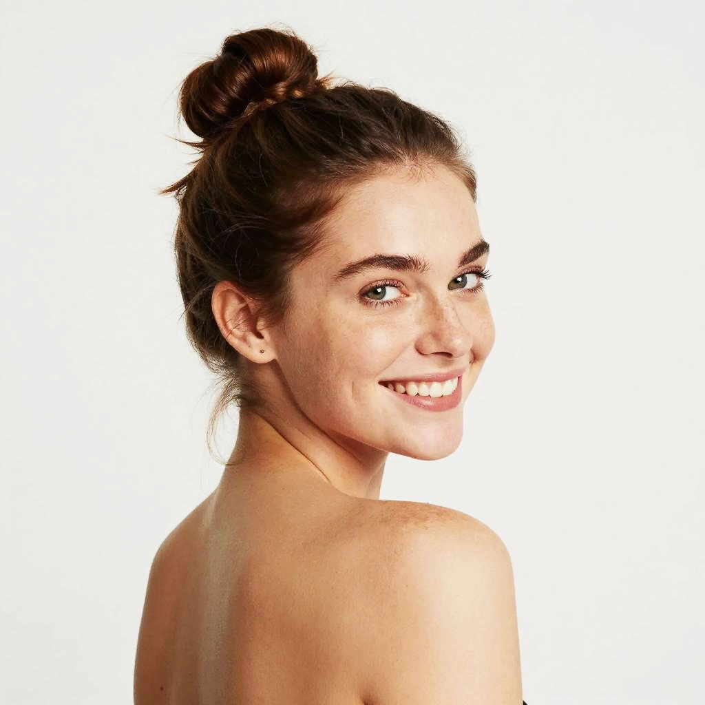 A young woman with clear skin and light freckles smiles radiantly over her shoulder against a plain white background. Her hair is styled in a casual top bun, reflecting a natural and fresh aesthetic often associated with Gen Z beauty trends.