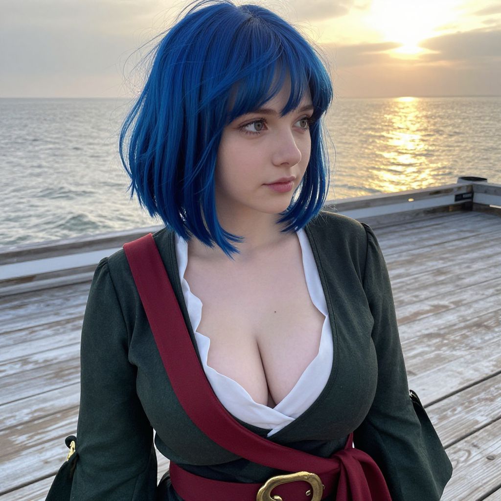 A woman with striking blue hair stands on a wooden pier at sunset, gazing thoughtfully into the distance. She is dressed in a dark green top with a deep neckline and a burgundy sash, creating a dramatic contrast with the serene ocean backdrop and golden light reflecting on the water.