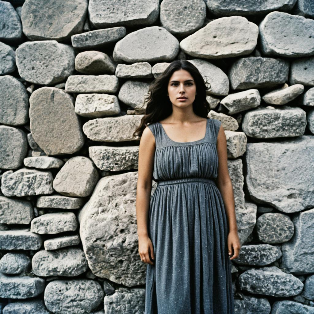 Woman in Gray Greek Chiton Dress Standing by Stone Wall