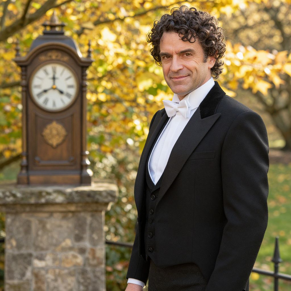 Elegant Man in Black Tuxedo Standing by Antique Clock in Autumn