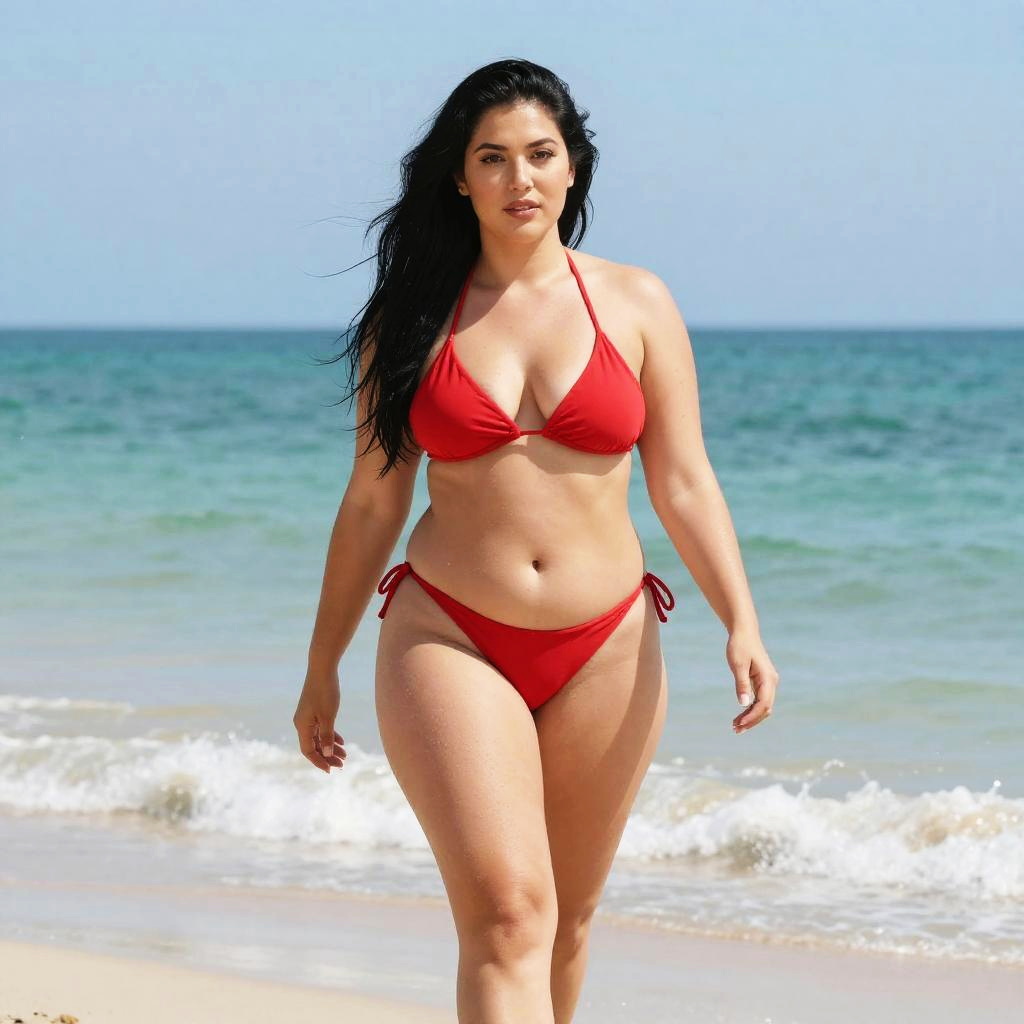 A confident woman walks along the shoreline wearing a vibrant red bikini, with the calm ocean and clear blue sky in the background. The natural beach setting and her relaxed demeanor convey a warm, summery vibe perfect for swimwear or lifestyle themes.