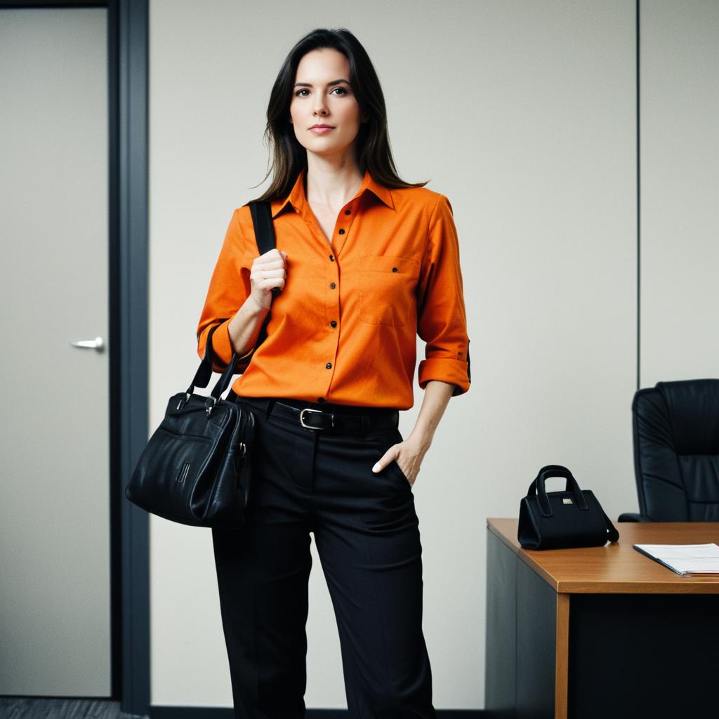 A confident woman dressed in a vibrant orange office shirt paired with black pants stands in a modern office setting. She carries a black shoulder bag and has a poised expression, embodying a professional and stylish business look.