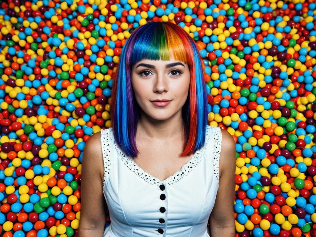 Woman with Rainbow Hair Standing Against Colorful Skittles-Like Background