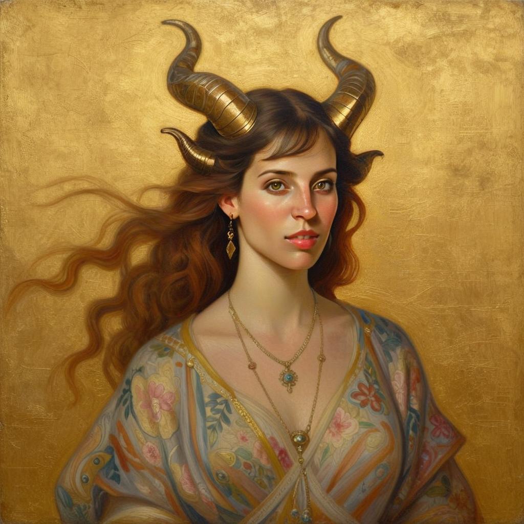 A captivating portrait of a woman adorned with ornate golden horns, set against a rich, textured gold background. The artwork features intricate details in her flowing hair and floral-patterned dress, showcasing a blend of fantasy elements and classical portraiture style.
