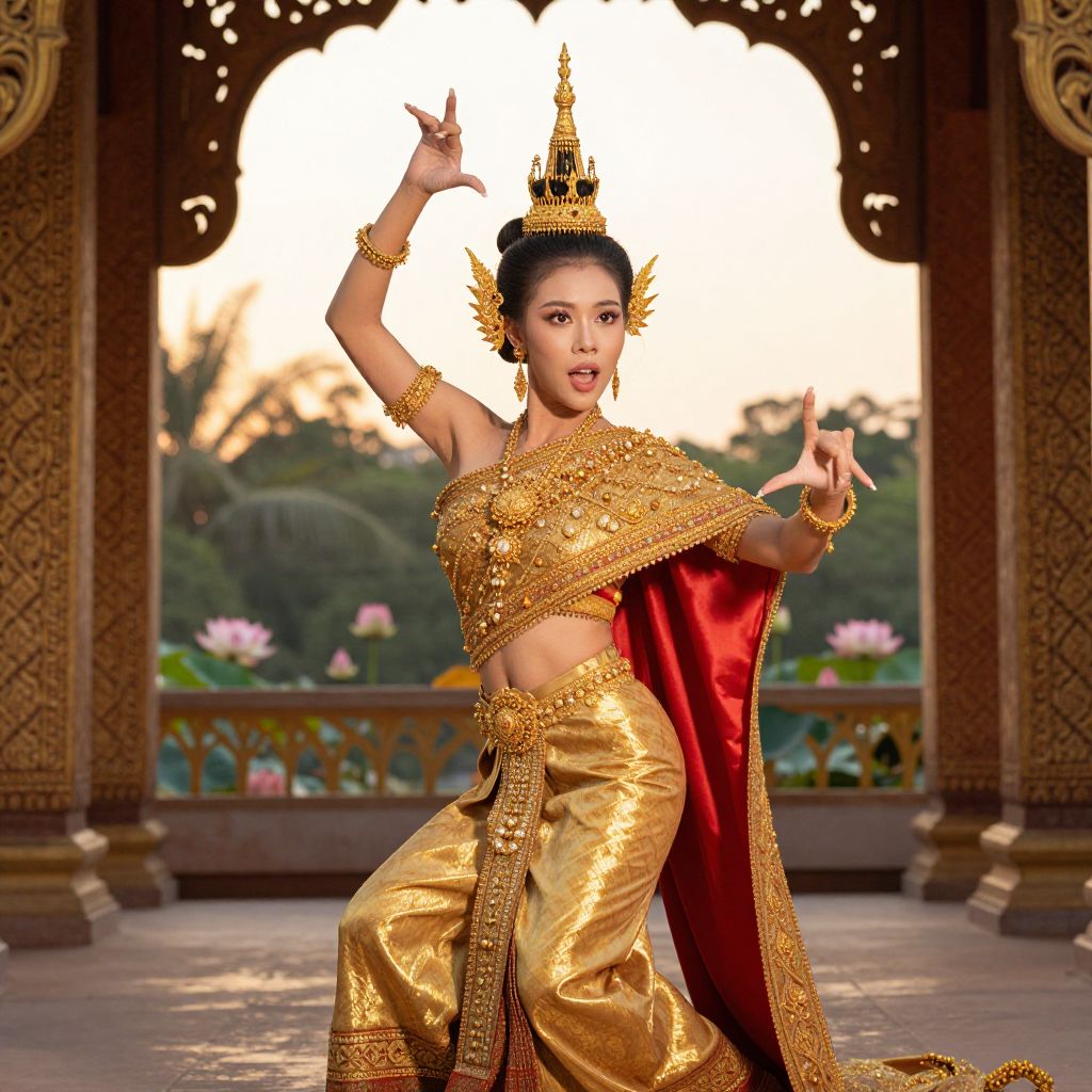 A woman dressed in traditional golden Thai dance costume poses gracefully inside an ornately decorated pavilion. Her intricate attire, complete with a tall, elaborate headdress and fine jewelry, reflects the elegance and cultural richness of classical Thai performance art.