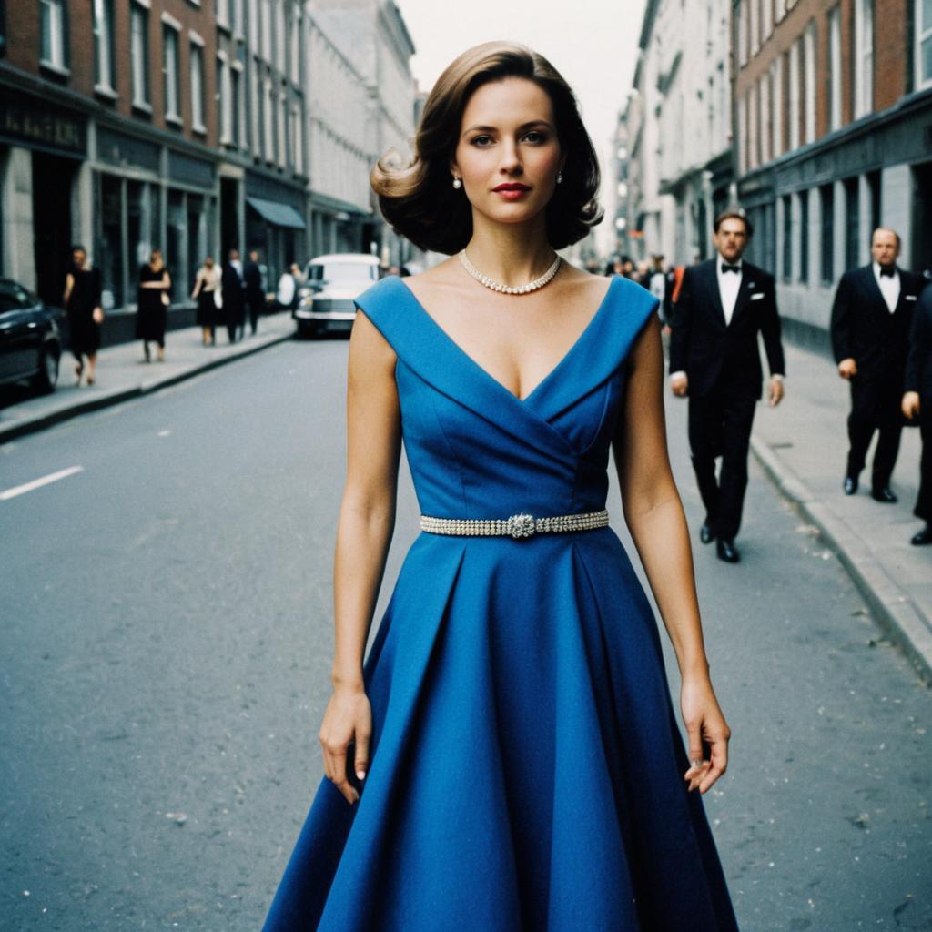 A woman stands confidently in the middle of a city street wearing a classy, formal blue dress accentuated with a pearl necklace and belt. The elegant vintage style and her poised expression convey timeless sophistication against a background of people dressed in black-tie attire.