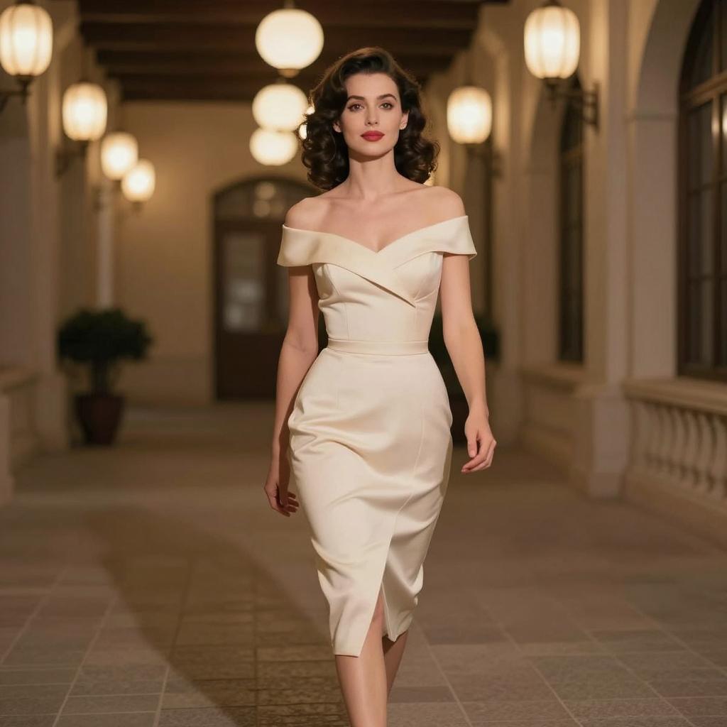 A confident woman in an elegant off-shoulder ivory dress walks gracefully in a softly lit corridor with arched windows and classic lantern-style lighting. The vintage-inspired hairstyle and poised expression emphasize timeless glamour and sophistication.