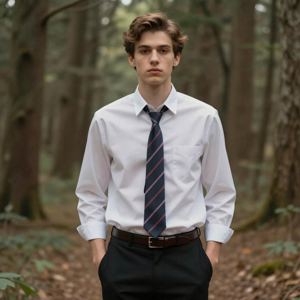 A young man stands confidently in a forest setting wearing a crisp white shirt, dark tie with red stripes, and black trousers. The image captures a modern Gen Z style with a mixture of formal and casual elements, set against a natural, blurred background.