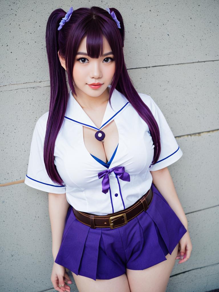 A young woman with long purple hair styled in twin tails poses against a textured wall, wearing a white sailor-style blouse with blue trim and a matching purple skirt. The outfit features a plunging neckline, adorned with a purple bow and a pendant, blending a school uniform aesthetic with a fashionable, modern twist in a vibrant, high-resolution portrait.