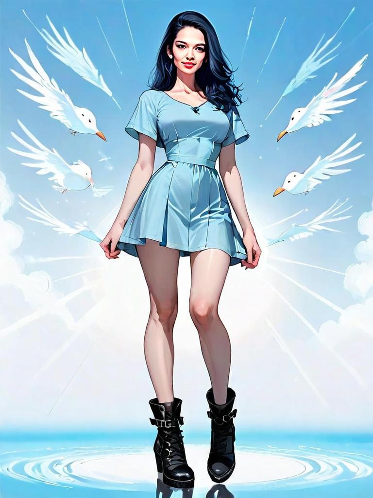 A striking digital illustration of a woman standing confidently in a chic light blue dress paired with black ankle boots. The artwork features a realistic comic style with vibrant colors and dynamic composition, complemented by flying white doves and a radiant, ethereal background.
