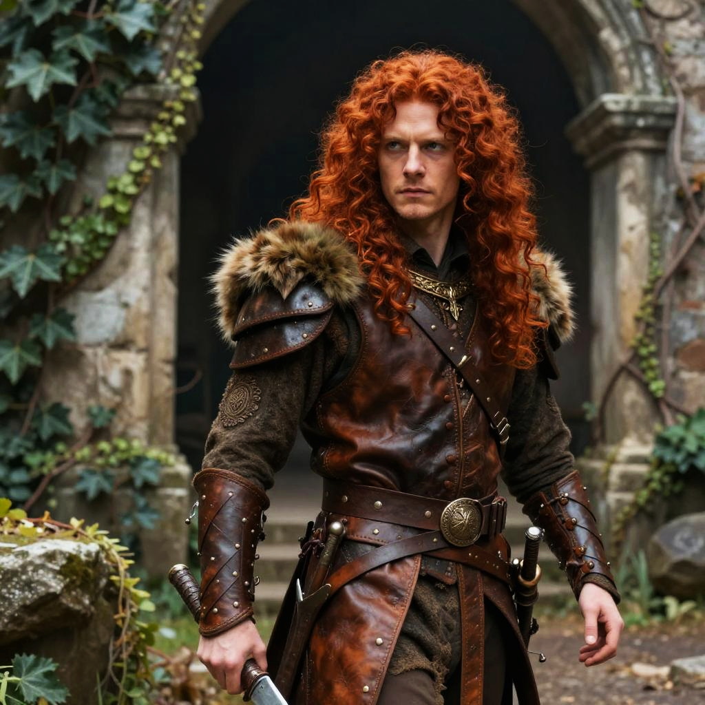 A determined man with long curly red hair dressed in medieval warrior attire stands ready in a stone archway surrounded by ivy. His leather armor features fur accents and studded details, evoking a historically inspired fantasy style reminiscent of a Viking or Celtic warrior.