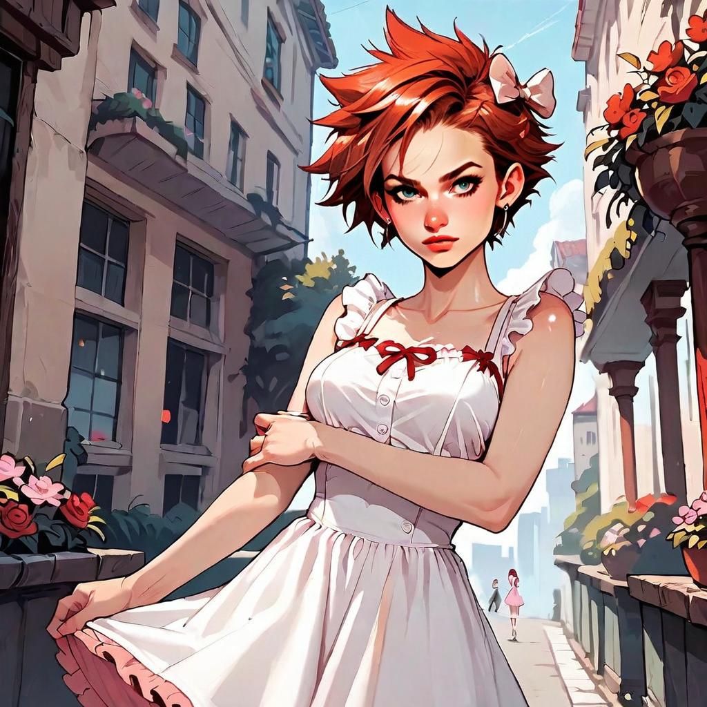 A digitally illustrated young woman with striking red hair styled in a tousled, voluminous fashion stands confidently on a sunlit, flower-lined urban street. She wears a white dress adorned with red ribbons, set against detailed background architecture in a vibrant anime-inspired art style. The scene captures a lively and modern yet nostalgic atmosphere with soft shadows and bright, clear skies.