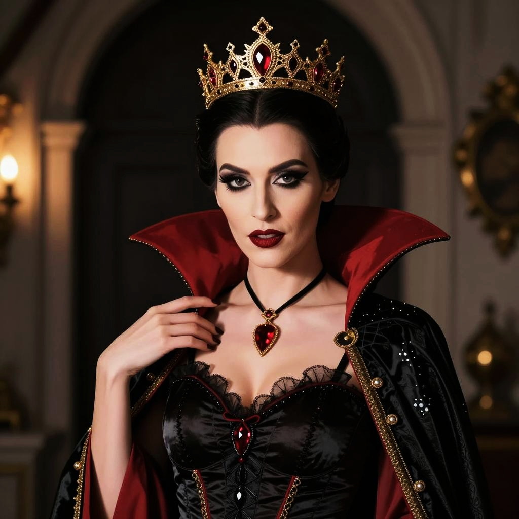 A woman dressed as a dark queen or vampire royalty, wearing an elaborate gold crown adorned with red gems and a dramatic black and red velvet cloak. Her makeup is bold and gothic, complementing the dark, regal style of her costume that evokes a mysterious and powerful presence.