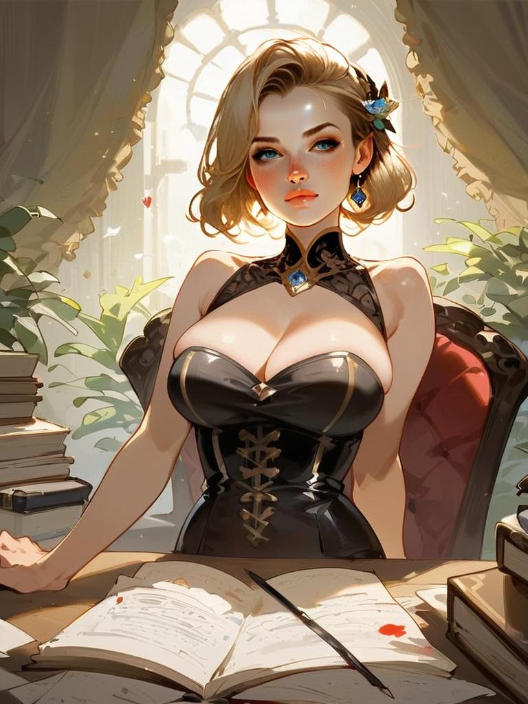 This digital illustration features a confident young woman seated at a desk, surrounded by stacks of books and an open notebook. Rendered in a detailed anime-inspired style, she wears a sleek, corset-like black dress adorned with gold accents and striking blue jewelry, set against the backdrop of a sunlit room with delicate curtains and leafy plants.