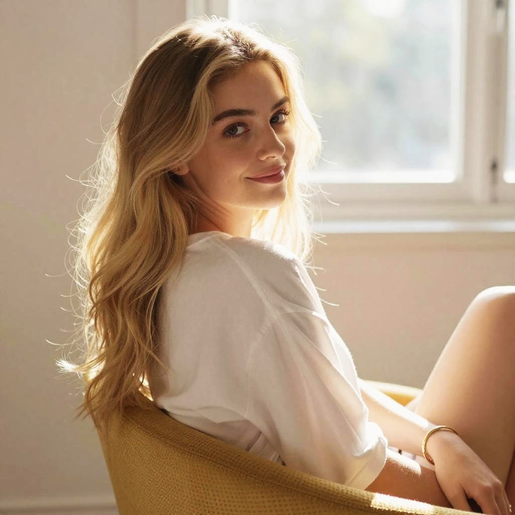 A young woman with long blonde hair sits comfortably on a mustard-yellow chair near a sunlit window, looking softly towards the camera with a gentle smile. The photo is captured in a natural light style, emphasizing warmth and a relaxed, intimate atmosphere.