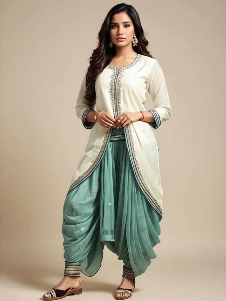 A woman models a stylish dhoti suit featuring a cream-colored, intricately embroidered kurta paired with teal pleated dhoti pants. The ensemble reflects traditional Indian cultural fashion with a modern photorealistic presentation on a neutral background.