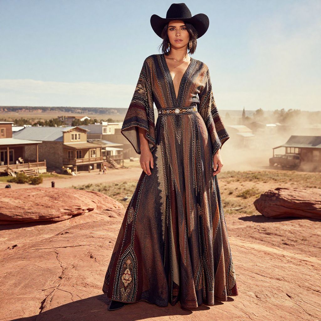 A woman stands confidently on a rocky desert landscape with a rustic western town in the background. She is wearing a flowing, patterned maxi dress and a black cowboy hat, combining bohemian and western style elements in a striking fashion statement.