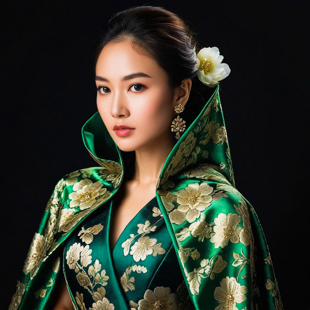 A woman poses elegantly wearing a luxurious green and gold floral brocade garment with a high collar, complemented by ornate gold earrings and a white flower tucked into her neatly styled hair. The image features a sophisticated and regal portrait style with dramatic lighting against a dark background.