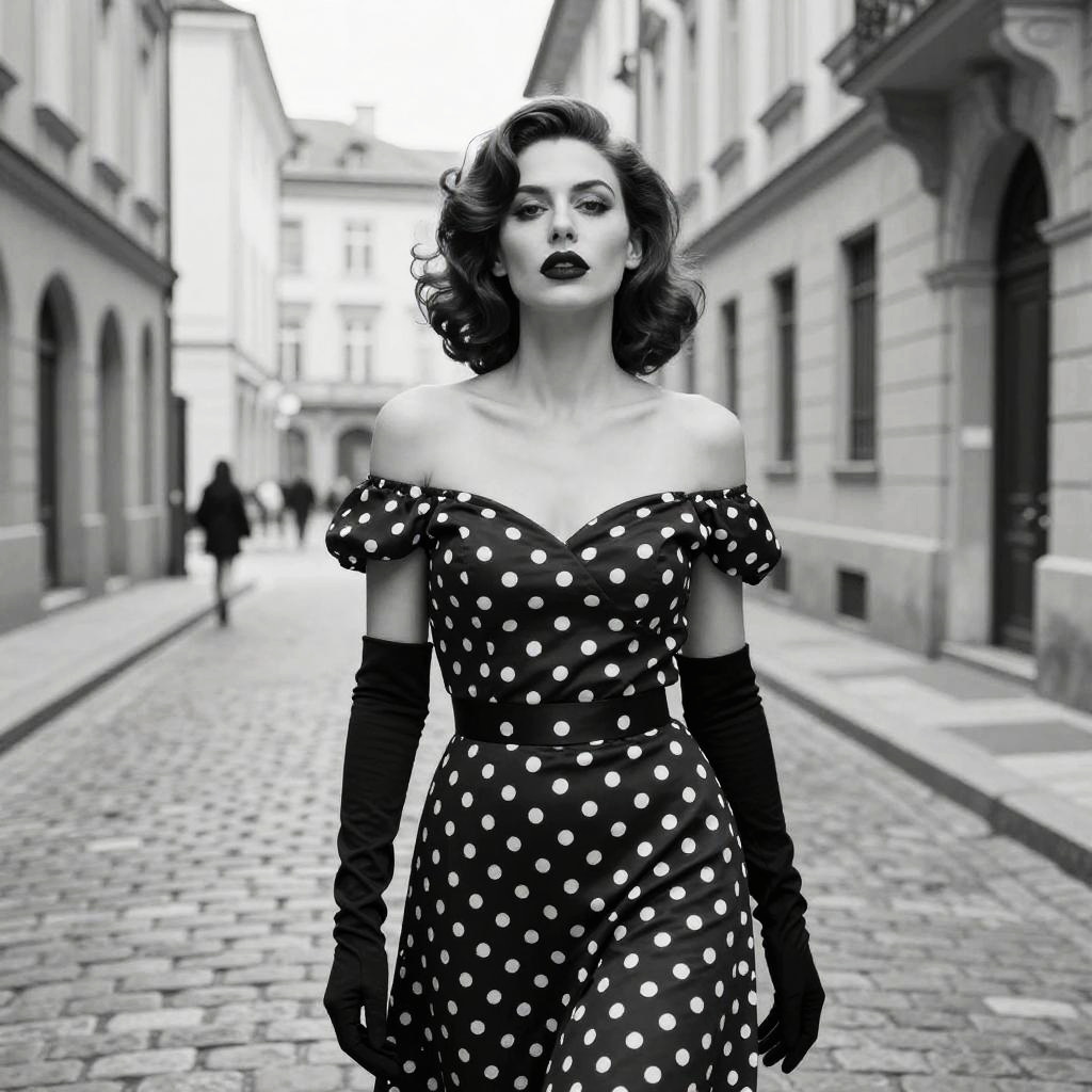 A confident woman in a vintage-inspired polka dot dress and long black gloves poses on a cobblestone street, evoking classic 1950s glamour. The black and white photograph enhances the timeless elegance of her look, styled with soft curls and bold lipstick.
