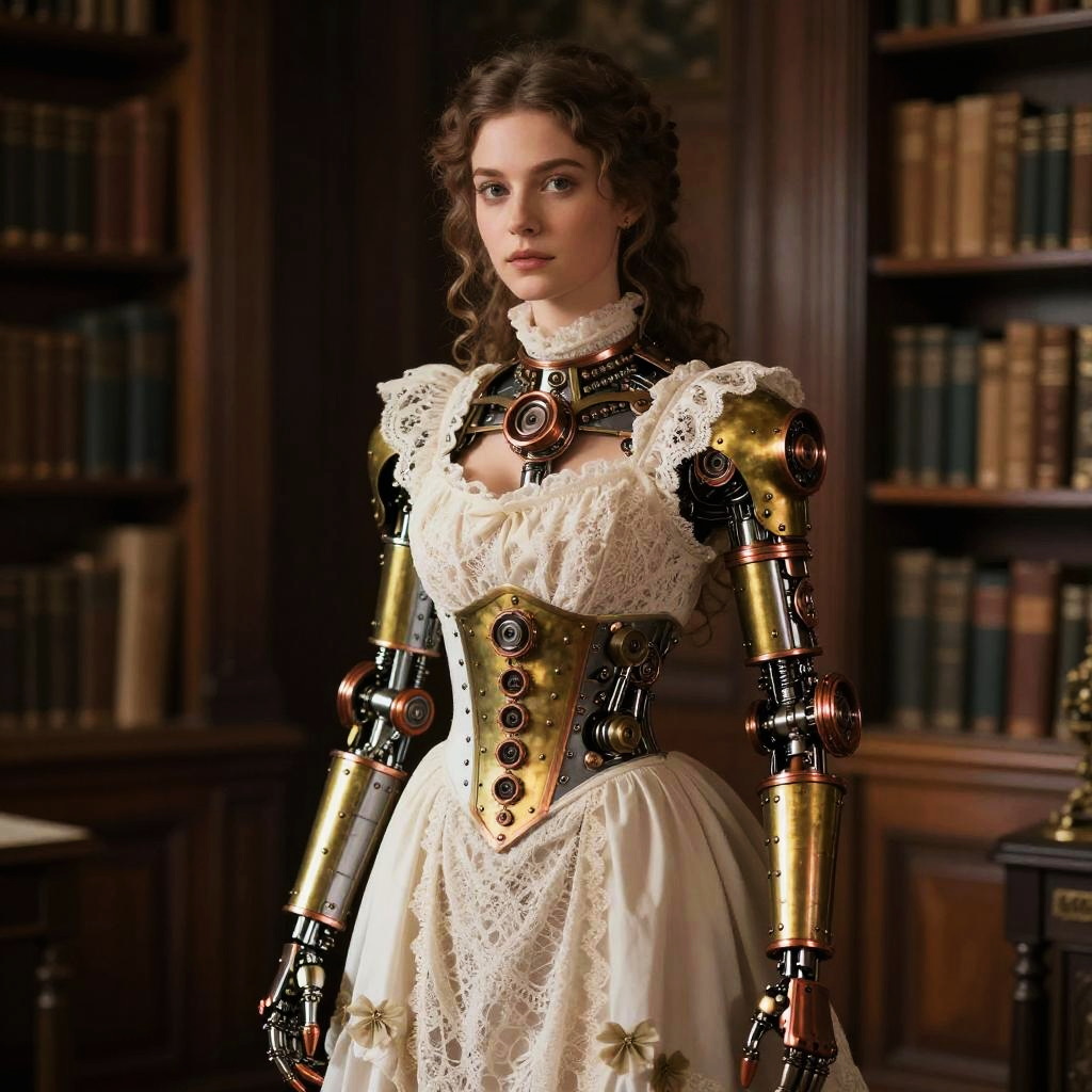 A young woman dressed in an elegant Victorian-style lace dress with intricate steampunk-inspired robotic arms and torso stands in a classic library setting. The blend of delicate historical fashion with mechanical, brass, and copper elements highlights a striking fusion of vintage style and futuristic robotics.