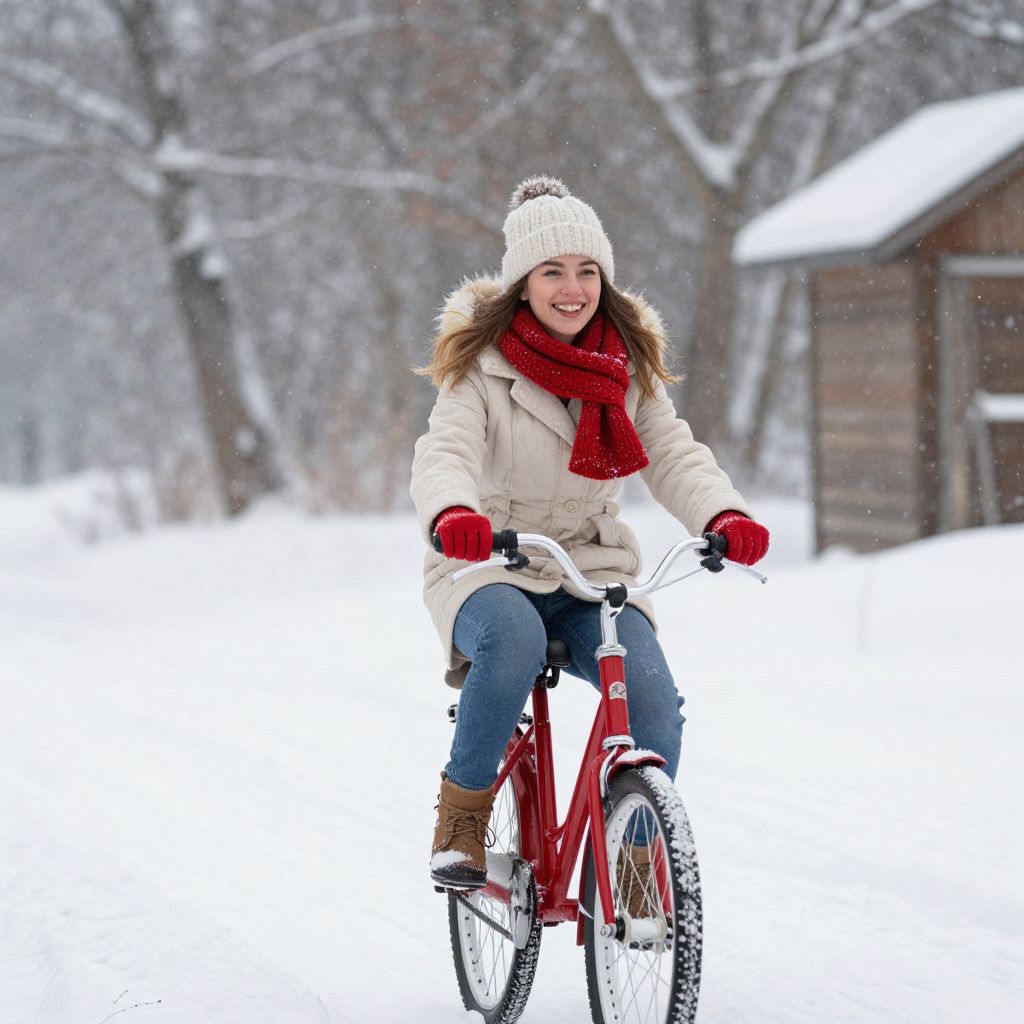 A young woman enjoys a winter bike ride on a snowy path, dressed warmly in a beige coat, red scarf, gloves, and a knitted hat. She pedals a red bicycle with a joyful smile, surrounded by snow-covered trees and rustic wooden buildings in the background.