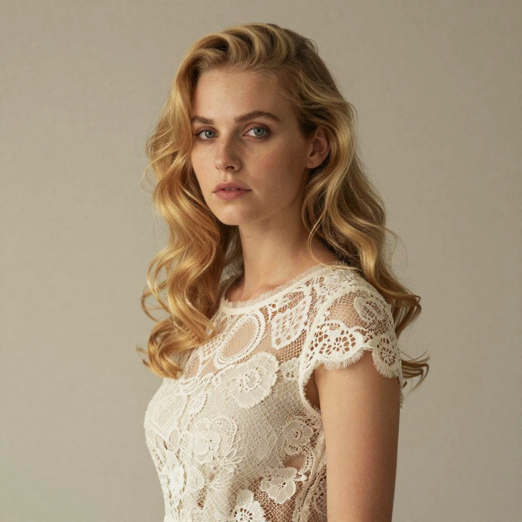 A young woman with flowing blonde hair poses against a neutral background, wearing an elegant lace top featuring intricate floral patterns. Her soft expression and the muted color palette create a refined and timeless portrait with a classic, natural style.