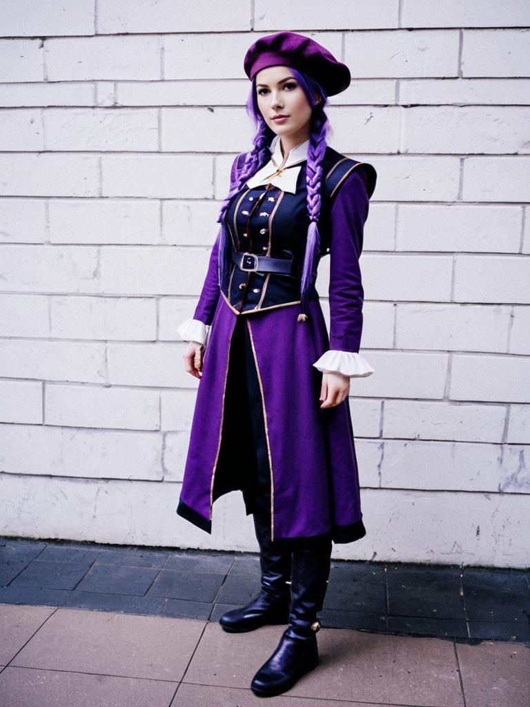 A woman dressed as Sion Eltnam Atlasia from the visual novel and game series, wearing a detailed purple and black costume with gold accents, including a beret and braided hair. The outfit combines elements of fantasy and steampunk styles, highlighting intricate buttons, a belted vest, and knee-high boots.