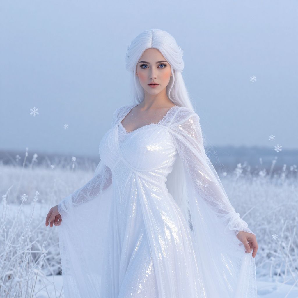 A woman with long white hair stands gracefully in a snowy landscape, dressed in a shimmering white gown with sheer sleeves that evoke a magical, ice queen aesthetic. The soft blue background and subtle snowflakes enhance the ethereal and fantasy-inspired atmosphere of the image.